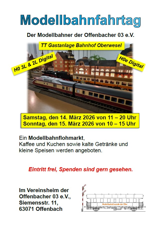 Die Modellbahner veranstalten wieder Ihre beliebten Fahrtage. im Vereinsraum werden auf den Tischen lange fahrtstrecken in H0 (Wechselstrom sowie Gleichstrom) und H0e (Schmalspur) Aufgebaut. In diesem Jahr ist zum ersten Mal eine Gastanlage in der Spurweite TT des Modellbahnstammtisch Offenbach dabei. Sie präsentieren einen Teil ihrer Modulanlage mit dem Thema „Rheintal“ und zwar den Bahnhof Oberwesel. Am Samstag wird bis in die Abendstunden gefahren und die Häuser werden beleuchtet.